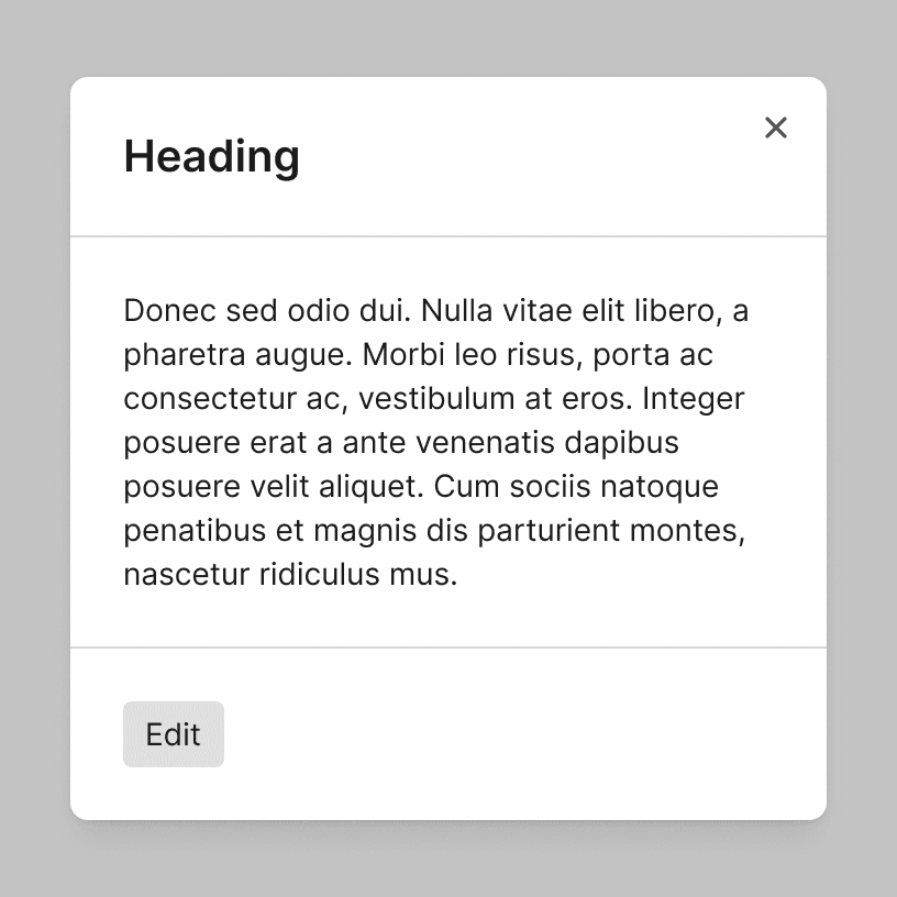 Information modals contain a lot of information or very complex information. Examples of information modals would be lists of reports, a user’s contact information, or deal details. These modals don’t require user action, though there can be buttons that allow the user to do something, such as Edit. They can also include a button that allows the user to exit, which should be labelled Close.