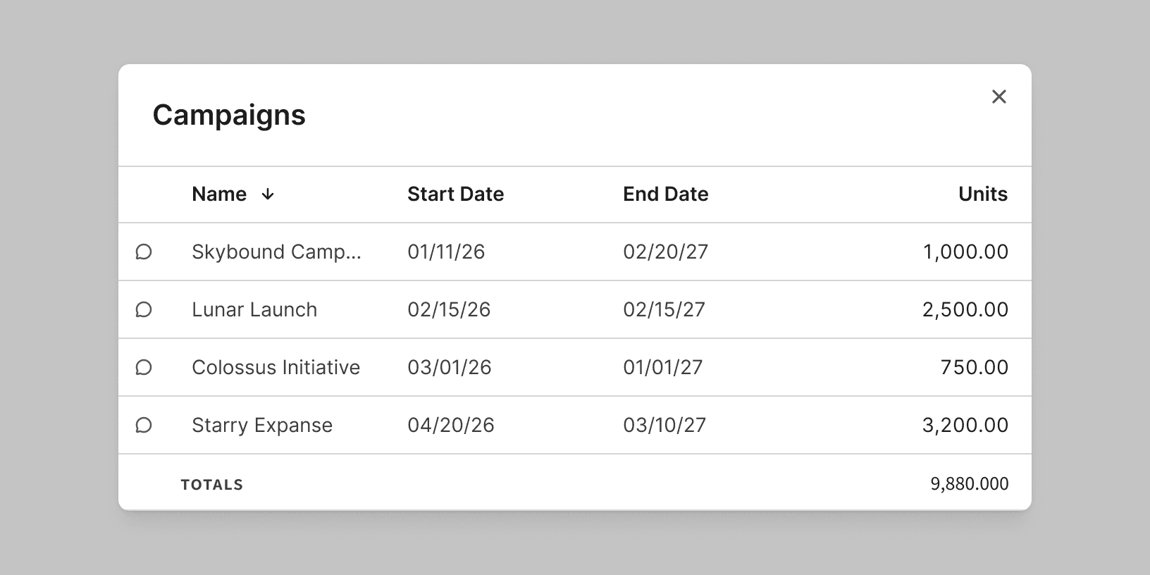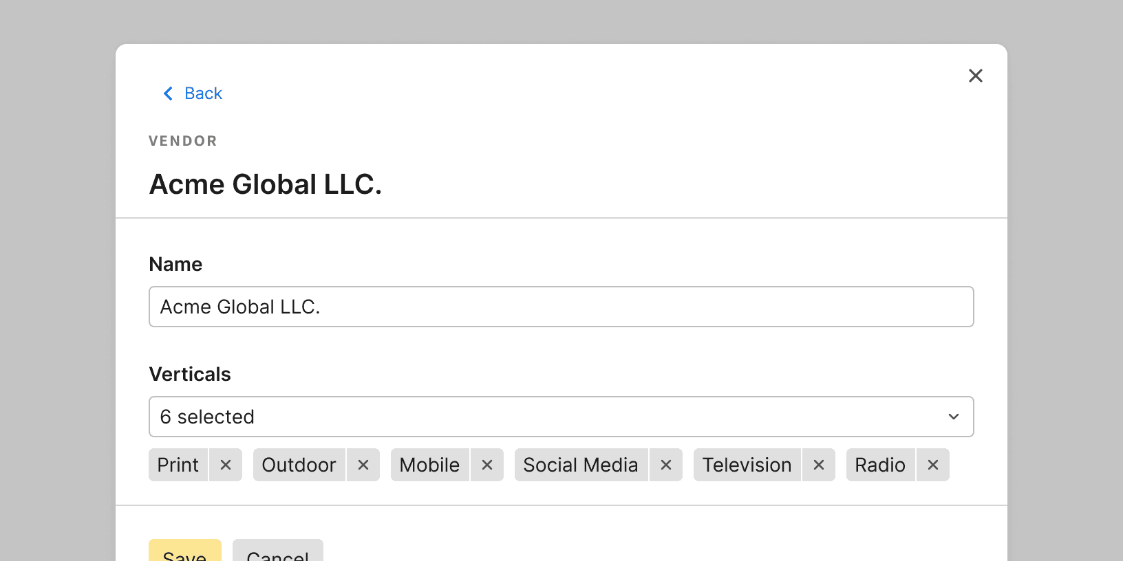 Information modals can include super headers. The super header indicates the type or category of the item that the user is looking at. For example, Property, Vendor, or Contact. The main heading for these types of modals should be the name of the selected item itself, so the super header provides a general description of the modal.