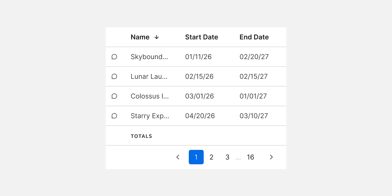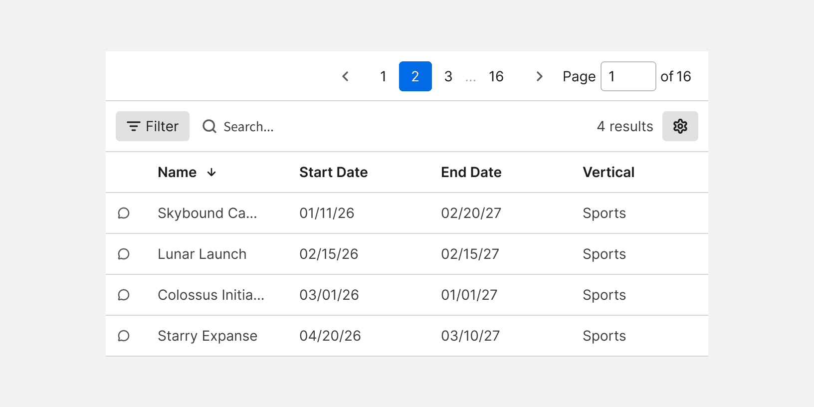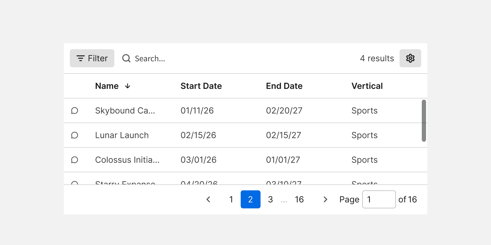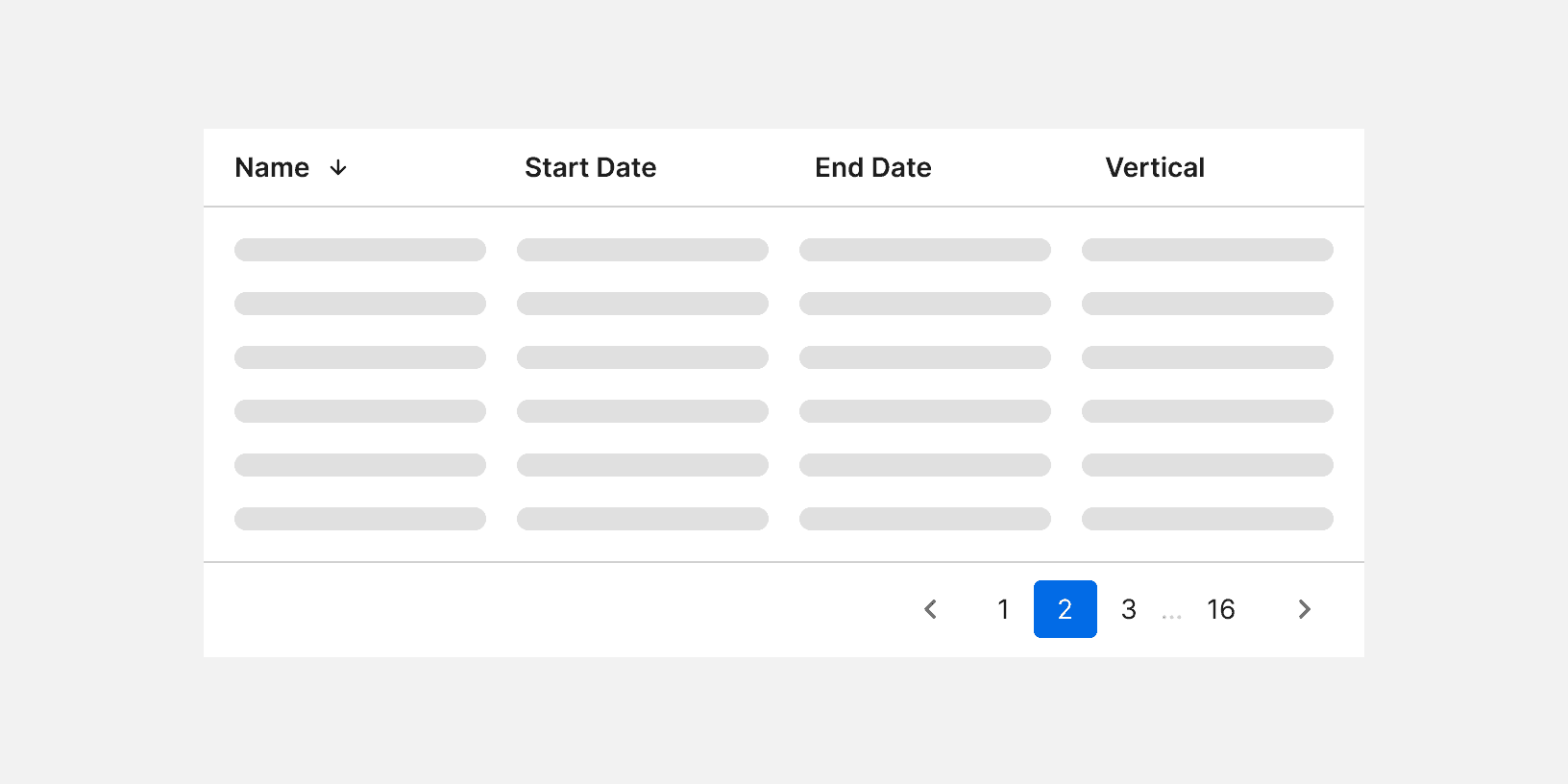 If there is scrollable content, the pagination should be displayed in a container that is fixed and always visible below the content. Avoid hiding the pagination at the bottom of scrollable content. The container should have a top border. When used within a modal, the pagination should be displayed in the modal footer.