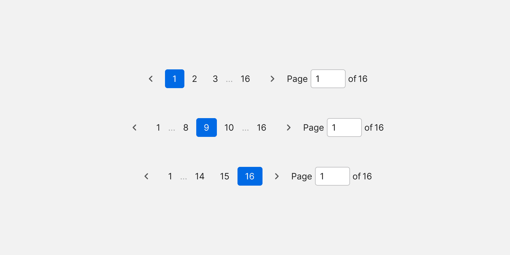 If there are more than 6 pages, an ellipsis will be shown to truncate the list. The first and last page button will always be visible. The page before and after the active page will also always be visible.