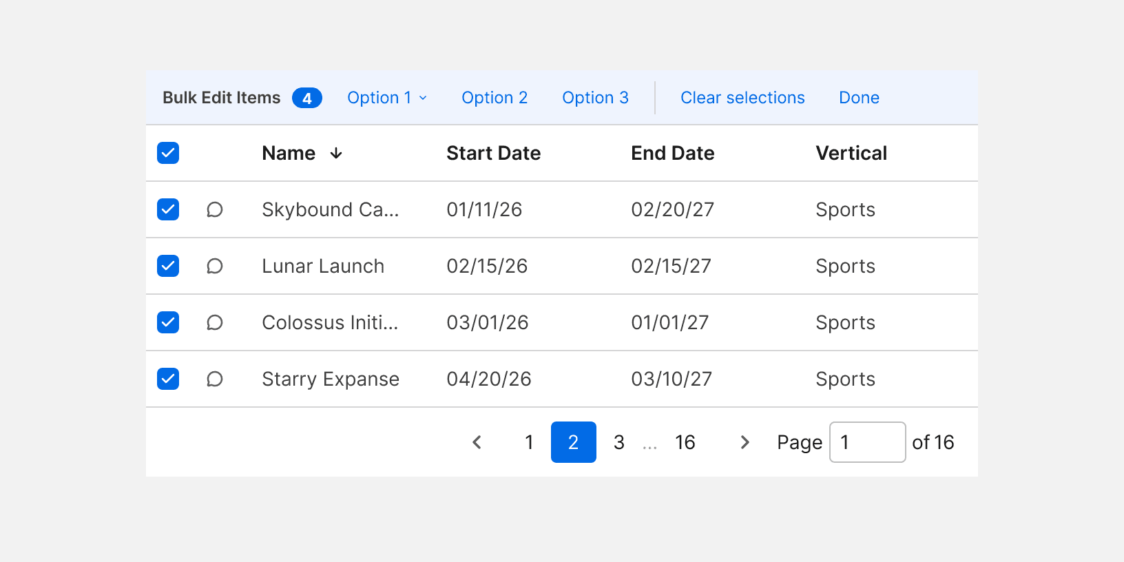If paginated content can be bulk edited, only the visible items will be edited. Provide a count in the UI that tells the user that they are editing only the visible items. If the user navigates to a new page using the pagination, the selections from the previous page will be lost, and the count will reset to none.